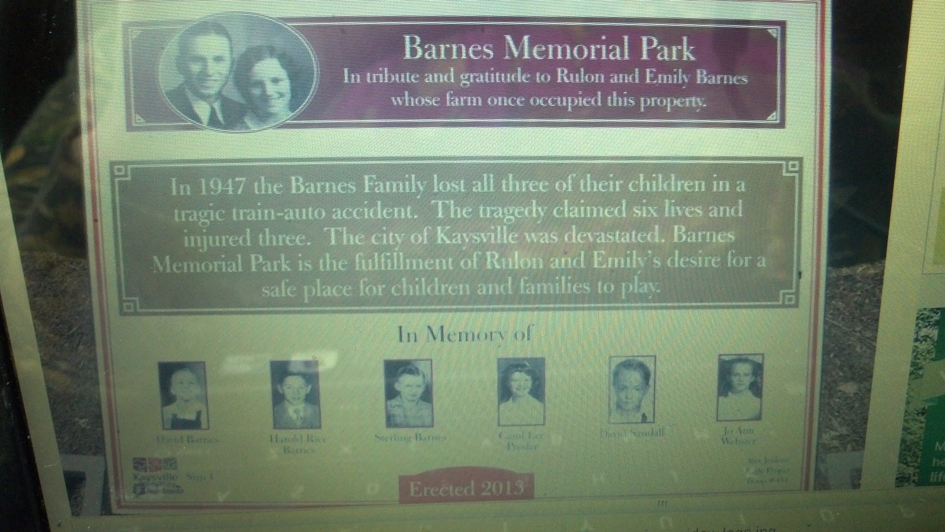 This sign recognizing their contribution and memorializing the children who lost their lives was placed in the Kaysville Park on July 17, 2013. The sign says, in part: “Barnes Memorial Park is the fulfillment of Rulon and Emily’s desire for a safe place for children and families to play.”