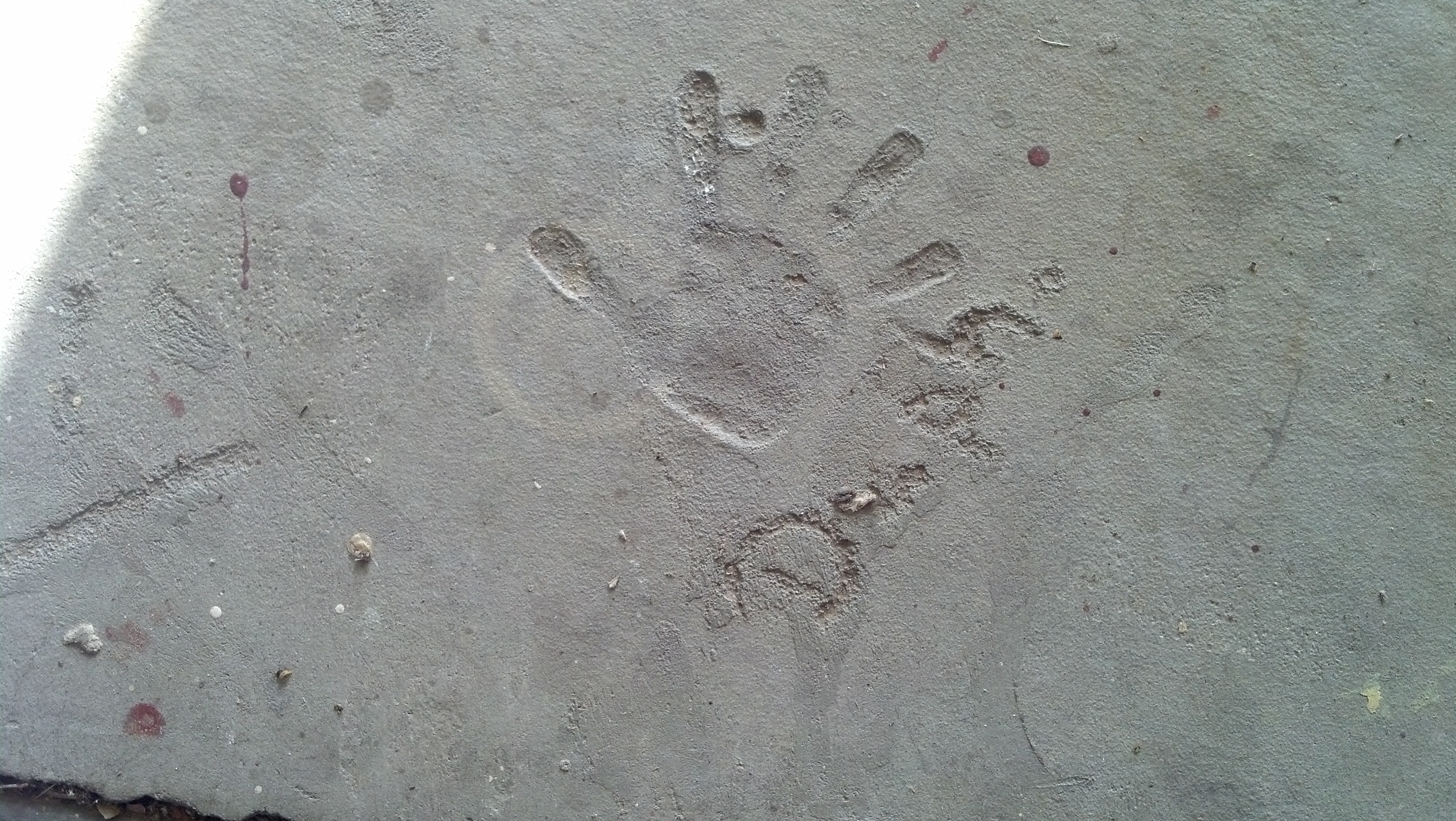It was a hand print. MY hand print with my name written right next to it in the cement. I must have been about four years old, as it was nearly the size of my son’s hand. I was speechless. What an incredible feeling. And, right next to my hand were my two cousins hand prints as well as my brother’s. We had done this when my grandpa poured the new cement when he added the shop onto the garage.