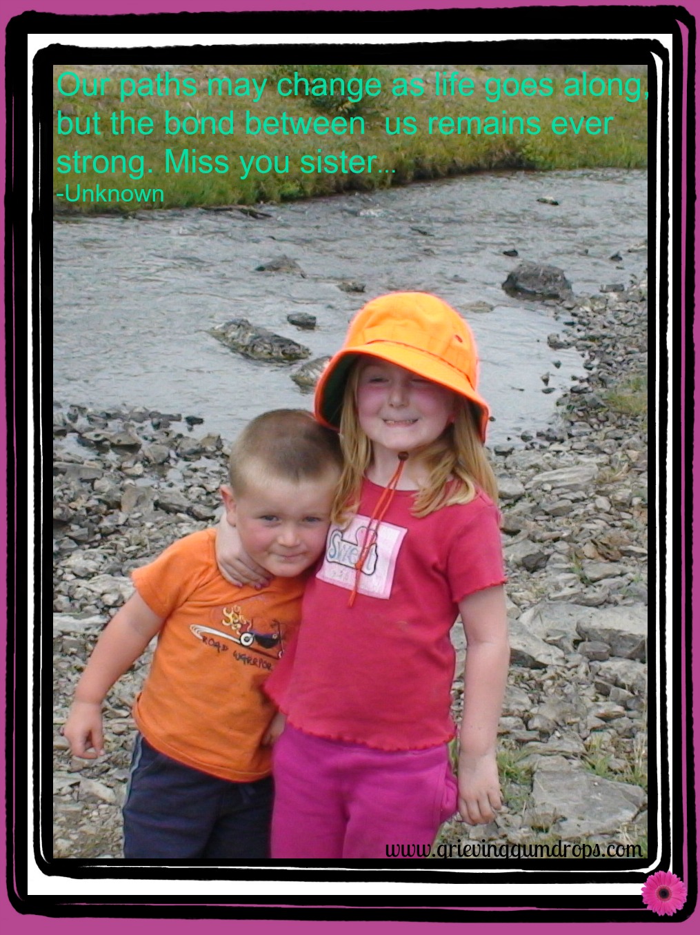 I can’t imagine what life was like for you, seeing your parents in such a desperate state, your world crumbling down, not sure of what tomorrow would bring. You weren’t sure how to act, or what to say and neither were we. They said you would be too young to remember, yet with your incredible mind, you have proved that to be nothing more than a myth.  For months and years, bits and pieces you have spoken, reminding me that you too were there that horrible day….You know it and you still see it.  A little boy sitting among the rocks and weeds clinging to his mother, watching and wondering, soaking it all in as police arrived and your sister was flown away in a helicopter.  Just minutes before your life was perfect. Not a care in the world, as it should be for a young boy.  All that mattered then was playing, what was for dinner, how many bugs were on the sidewalk and slaying dragons in the house.     www.grievinggumdrops.com